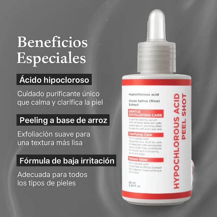 Este serum combina ácido hipocloroso + extracto de arroz, una mezcla única que limpia, regenera y exfolia la piel sin maltratarla.